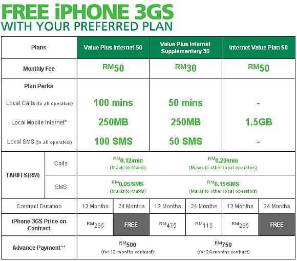 In terms of bundling, the iPhone 3GS (believed to be the 8GB version) is offered on Value Plus Internet 50, Value Plus Internet supplementary 30 & Internet Value Plan 50. The first 2 are all-in-one package where it comes with voice, SMS & data while the Internet Value Plan 50 comes bundled with 1.5GB monthly data and calls/sms are charged separately.