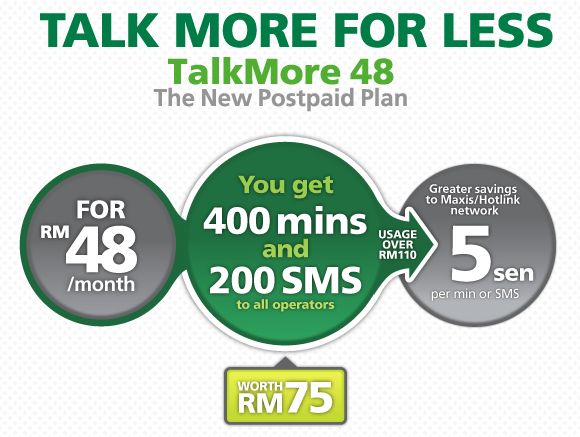 Maxis introduces TalkMore 48 which is a new postpaid plan that comes pre-bundled with talktime minutes and SMS for just RM48/month. It comes with 400 minutes of calls and 200 SMS which can be used to all networks in Malaysia that’s valued at RM75.