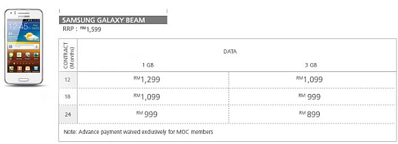 Maxis has finally revealed its Samsung Galaxy Beam bundling pricing which goes from as low as RM899. The Galaxy Beam with its built-in pico projector is priced at RM1,599 outright. As usual, they are offering it with any Maxis postpaid plan of Value First and above with an add-on data plan of 1GB or 3GB. There are 3 contract durations of 12 months, 18 months and 24 months available.