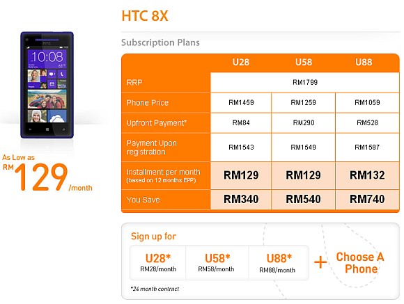 If you’re eyeing for HTC’s Windows Phone 8X, U Mobile now offers the device on contract from as low as RM1,059. Retailing at RM1,799, the 8X is bundled on U28 (1GB), U58 (2GB) and U88 (3GB) with 24 months contract.