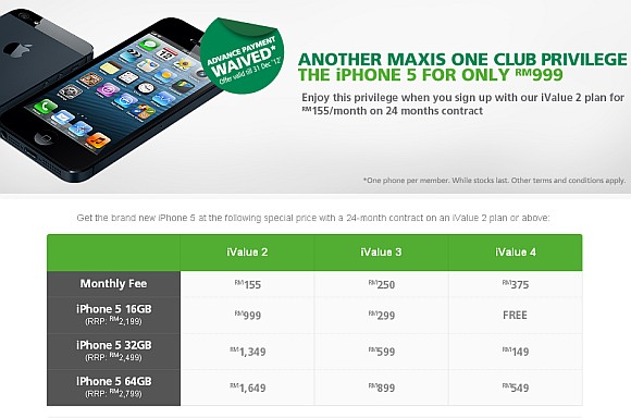 Maxis has finally revealed its Maxis One Club offering for the iPhone 5 which can be yours for as low as RM999. It is tied to iValue 2, 3 & 4 with 24 months contract duration.
