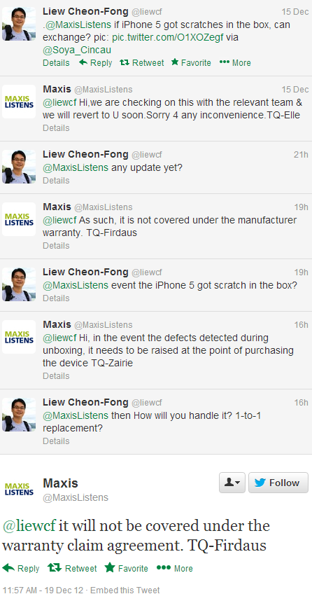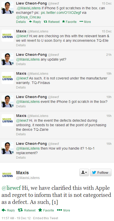 Blogger LiewCF checked with Maxis for clarification if Apple would replace scratched iPhone 5. Maxis’ response was a perplexing one. The operator claimed that it checked with Apple and iPhones that come scratched out of the box are “not categorized as a defect” and will not be replaced.