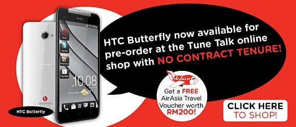 If you can’t wait for the big 3 telcos to offer the HTC Butterfly, TuneTalk has fired the first salvo by offering the device on pre-order at their online store. Selling at its original retail price of RM2,299, TuneTalk’s online store is throwing additional goodies such as a free TuneTalk SIM Pack and 1 month Cun Plan that comes with 1GB data and 60 minutes of calls. In addition, they are also givnig away RM200 AirAsia E-Gift Voucher while stocks last. Shipping is also free of charge.
