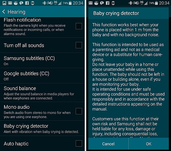 Hidden inside the accessibility menu in the Galaxy S5 is a little known Baby crying detector. You place the Galaxy S5 close to your baby and when the child cries the detector will emit a vibrating alert to let you know that the little one needs attending to.