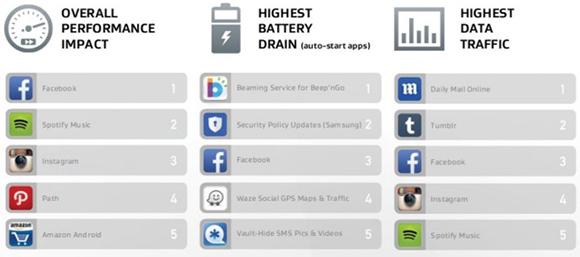 Social media and video apps take the biggest bite in terms of data usage, Instagram, Spotify, Facebook, Netflix and Tumblr are by far the highest ranking. thougn the Daily Mail app is the worst offender. Because of their consistent ranking in almost every category these apps have been listed as AVG’s top 10 overall performance sappers of Q4 2014.