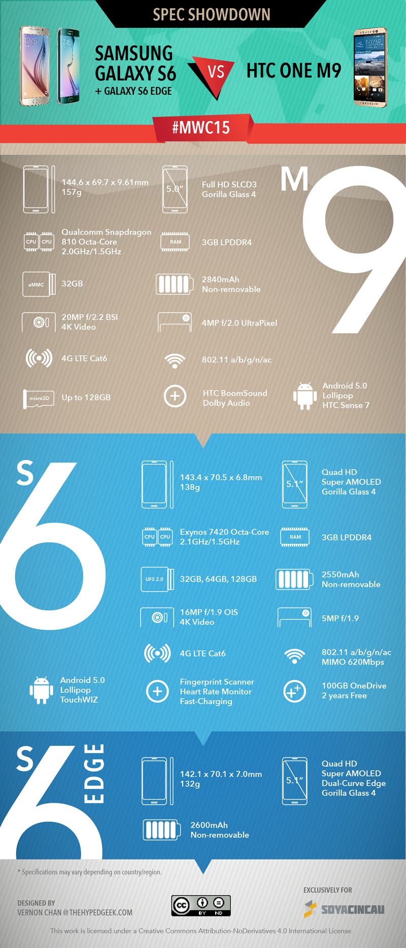 The HTC One M9 and Samsung Galaxy S6/Galaxy S6 edge were the biggest announcements to kick off MWC 2015. The One M9 appears to be an incremental update retaining its iconic unibody brushed metal finish with upgraded hardware underneath. Meanwhile Samsung has completely overhauled its new flagship model with a fresh premium design and advanced internals for both processor and RAM. The Galaxy S6 edge is essential the same device as the Galaxy S6 but it gets a dual-curved edge display and it is slightly larger battery capacity.