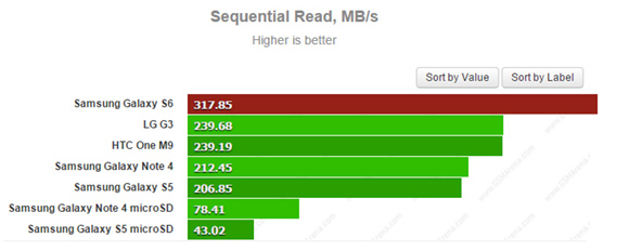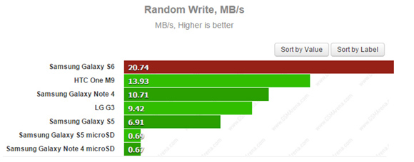 The results put the Samsung Galaxy S6 on top of sequential and random read with a huge advantage over the competition as well as in random read operations but it’s on par with the Galaxy Note 4 on sequential write tests, and it’s lagging behind the HTC One M9 and the Note 4 in sequential write however.