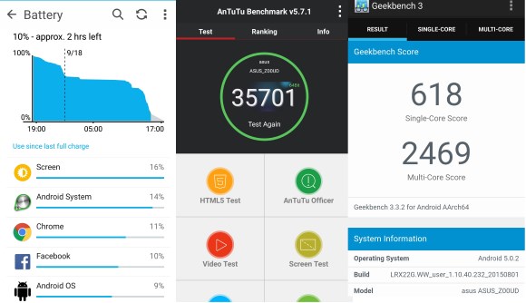 We ran tests on the Zenfone Selfie using GeekBench and Antutu to gauge how well it performs. It scored a decent 618 (Single-core) and 2,469 (Multi-core) on Geekbench while it nailed 35701 on Antutu, which is average for a Snapdragon 615 smart phone.