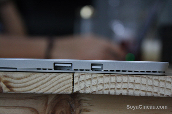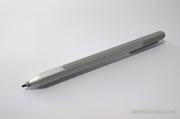 The newly included Surface Pen now has 1024 levels of pressure sensitivity in its reworked body. A big jump from the older 256 levels stylus. Along the shaft there will be a rubber strip and the lower end serves as a right-click button, so hold it down while tapping on the screen allows you to well…. right-click. On the other end, the “eraser” serves as a One Note launcher with one click, while a double tap gets you a print-screen.