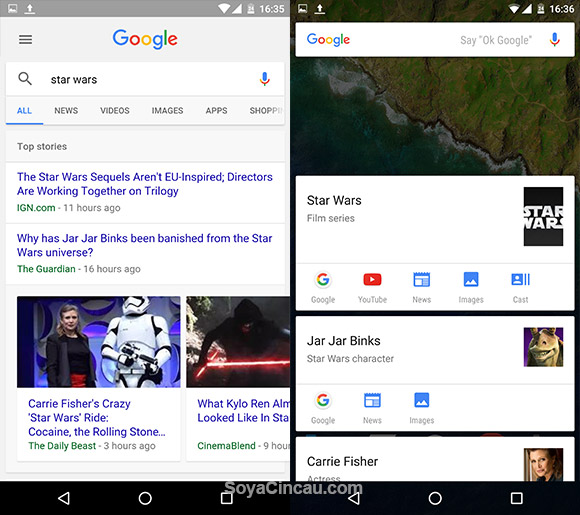 Users can now pull information based on contextual data on their screens. E.g. a text message containing a movie title, holding down your home button will allow you to bring up Google cards related to the movie.