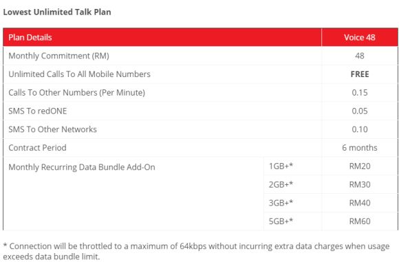 Calls to other numbers are charged at 15 sen/minute while SMS are charged at 5 sen each to redONE numbers and 10 sen each to other telcos. Despite not being tied to a device, the Voice 48 plan has a minimum contract period of 6 months.