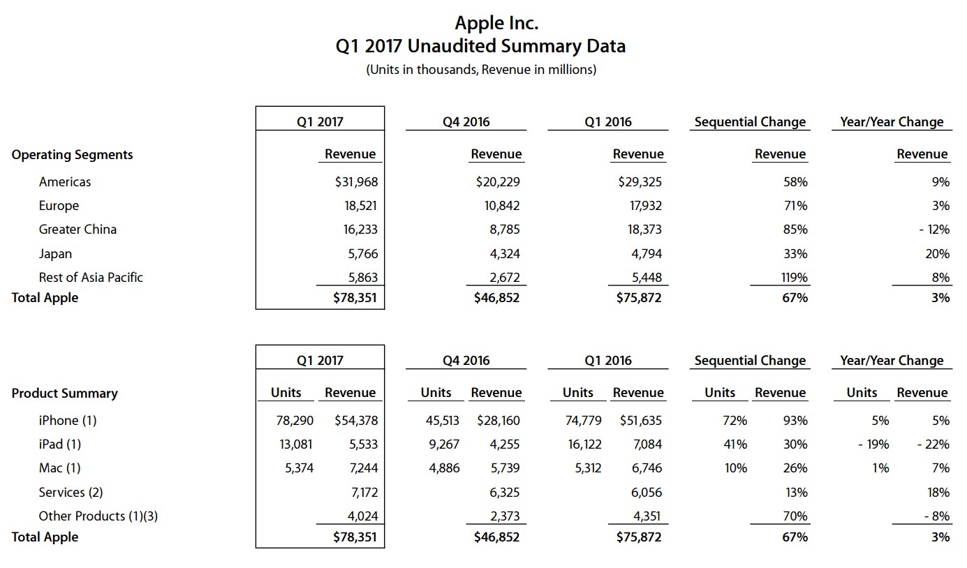Looking at Apple’s revenue by region, the company saw a year over year increase in revenue the Americas (+9%), Europe (+3%), Japan (+20%) and the Rest of Asia-Pacific (+8%). However, revenue in Greater China fell dramatically, dropping 12% to just over USD16 billion in Q1 2017.