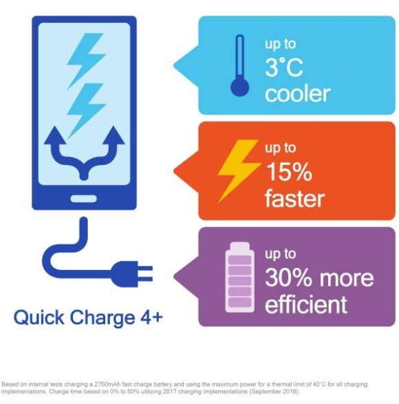 According to Qualcomm, the latest Quick Charge 4+ offers the same benefits as Quick Charge 4 and it comes with better thermal management, faster charging and better safety features. It comes with Dual Charge, that comes with a second power management IC which helps to lower thermal dissipation while reducing charge times. In summary, a Quick Charge 4+ compatible device can offer up to 15% faster charging or 30% better efficiency compared to Quick Charge 4. Quick Charge 4 promises 50% charge in just 15 minutes for a device with a 2,750mAh battery.
