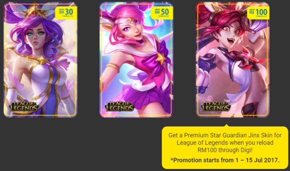 Digi is also emphasising that it is easy to purchase in-game items without the need of having a credit and debit card. With Gaming Freedom, you can buy items for games such as League of Legends, Dota 2, Counter-Strike and FIFA directly from your Digi Prepaid credit or have it billed directly to your postpaid account. Beginning 1st July, a new Leagues of Legends collectable top-up cards will be available and you can get a Premium Star Guardian Jinx Skin with an RM100 top up while stocks last.