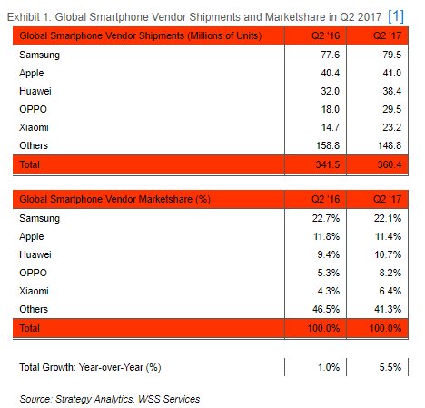 For the past one year, the top 5 is usually dominated by Samsung and Apple, followed by the typical Chinese giants such as Huawei, OPPO and vivo. According to Strategy Analytics’ global smartphone market share report for Q2 2017, Xiaomi has made a comeback by shipping 23.2 million phones in the last quarter, beating vivo from the number 5 spot.