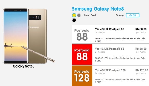 Apart from the usual four telcos, Yes is also offering the latest Galaxy Note8 with their 4G LTE Postpaid plans. The Galaxy Note8 that retails at RM3,999 is going for as low as RM1,899. The plans offer as much as 50GB of high-speed data with no weekday/weekend limitation and the plans are priced under RM130/month.