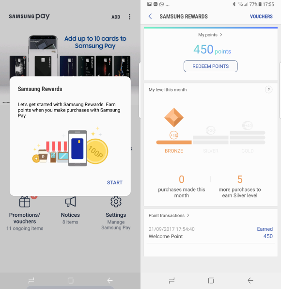 Samsung Rewards gives you 10 points per purchase. Once you’ve unlocked the Silver level with 5 purchases, you can earn 20 points for every purchase. The highest Gold level is achieved after 20 purchases and that grants you 40 points for every transaction.