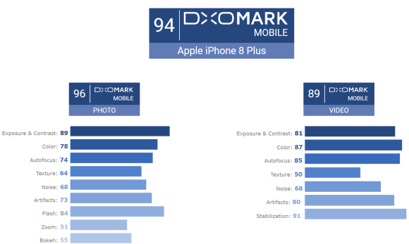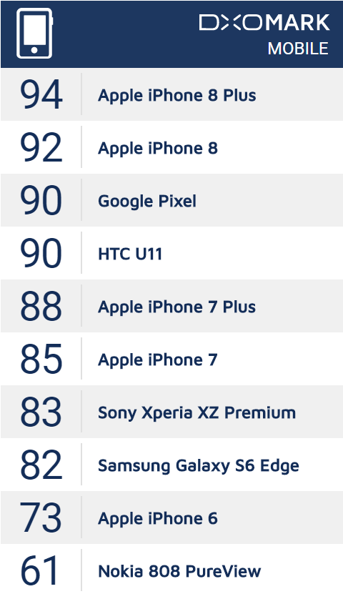 The latest iPhone 8 Plus and the iPhone 8 are now the highest rated smartphones on DxOMark Mobile. The iPhone 8 Plus scored a new record high at 94 points while the single-camera iPhone 8 achieved 92 points.