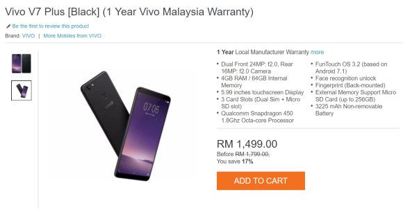 As spotted on Lazada, the vivo V7+ with 1 year official vivo Malaysia warranty is listed at RM1,499. The pricing is quite close to India where the vivo V7+ was launched with an INR21,990 price tag (about RM1420).