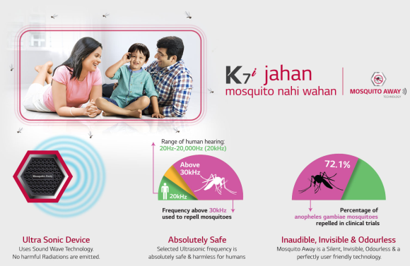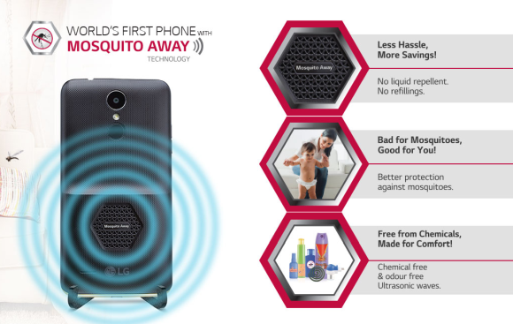 With its Mosquito Away Technology, the LG K7i provides you with personal protection from those pesky mosquitoes. It keeps insects away by emitting an ultrasonic sound wave above 30kHz which is above the normal human hearing range (20Hz-20,000Hz).