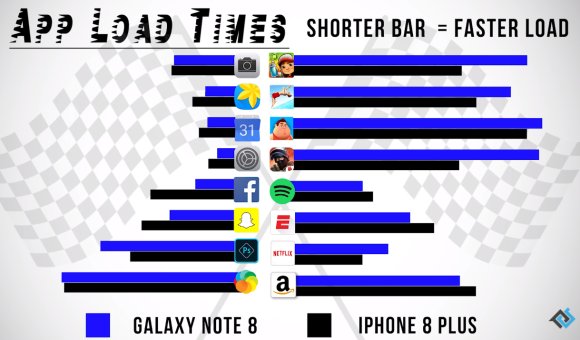 Things start to get interesting in the second round as Phonebuff goes back to the apps that have already been loaded. The Galaxy Note8 is clearly faster this time and that could be due to its 6GB of RAM. Eventually, the Note8 is faster by 6 seconds than the iPhone 8 Plus. Below is a recap of its individual app loading performance: