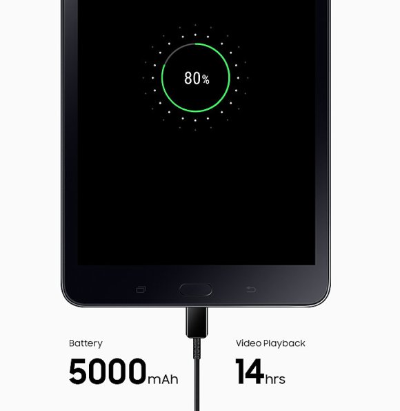The Galaxy Tab A (2017) features a lightweight metal back design and it comes with an 8″ display that pushes a modest 1280×800 (WXGA) resolution. Unlike its previous Galaxy Tab A series, there’s no S Pen included for this 2017 model. With an optional dock, the tablet has a Home Mode which shows you useful information such as the time, calendar and weather while charging.