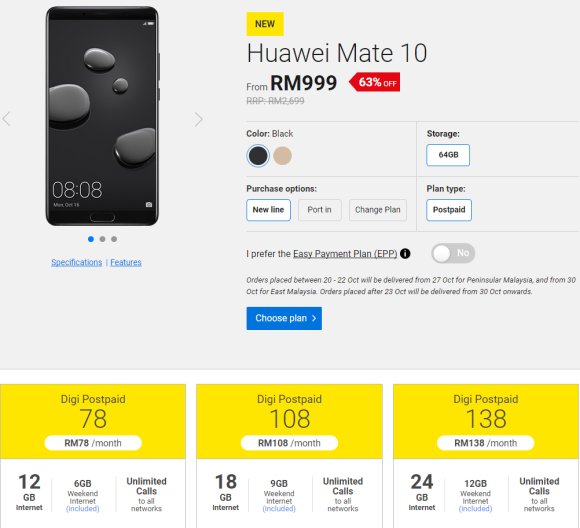 The Huawei Mate 10 is officially priced at RM2,699 in Malaysia and it comes with 4GB RAM and 64GB of storage. On Digi, the Mate 10 is priced as follows with a 24-month contract: