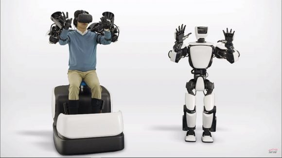 The control system called the Master Maneuvering System (MMS) can be used to operate the robot’s entire body, with 16 torque servo modules in the chair, motion and force sensors at the feet, with 29 torque servo modules in the robot itself. So the user can move the robot by making walking movements without even needing to actually physically move and the robot has balance control too, so it won’t suddenly topple over if it hits something.