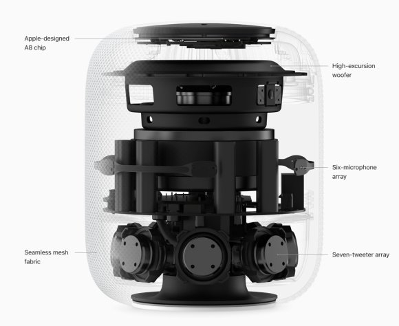 Powering the HomePod is an Apple A8 chip and the speaker is covered in a mesh fabric that looks like a crochet yarn. It comes in either white or space grey.