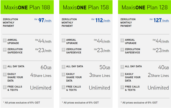 For those who don’t want to spend money upfront, there’s Maxis Zerolution. It’s also available on MaxisONE 128, 158 and 188, and below are the monthly instalments.