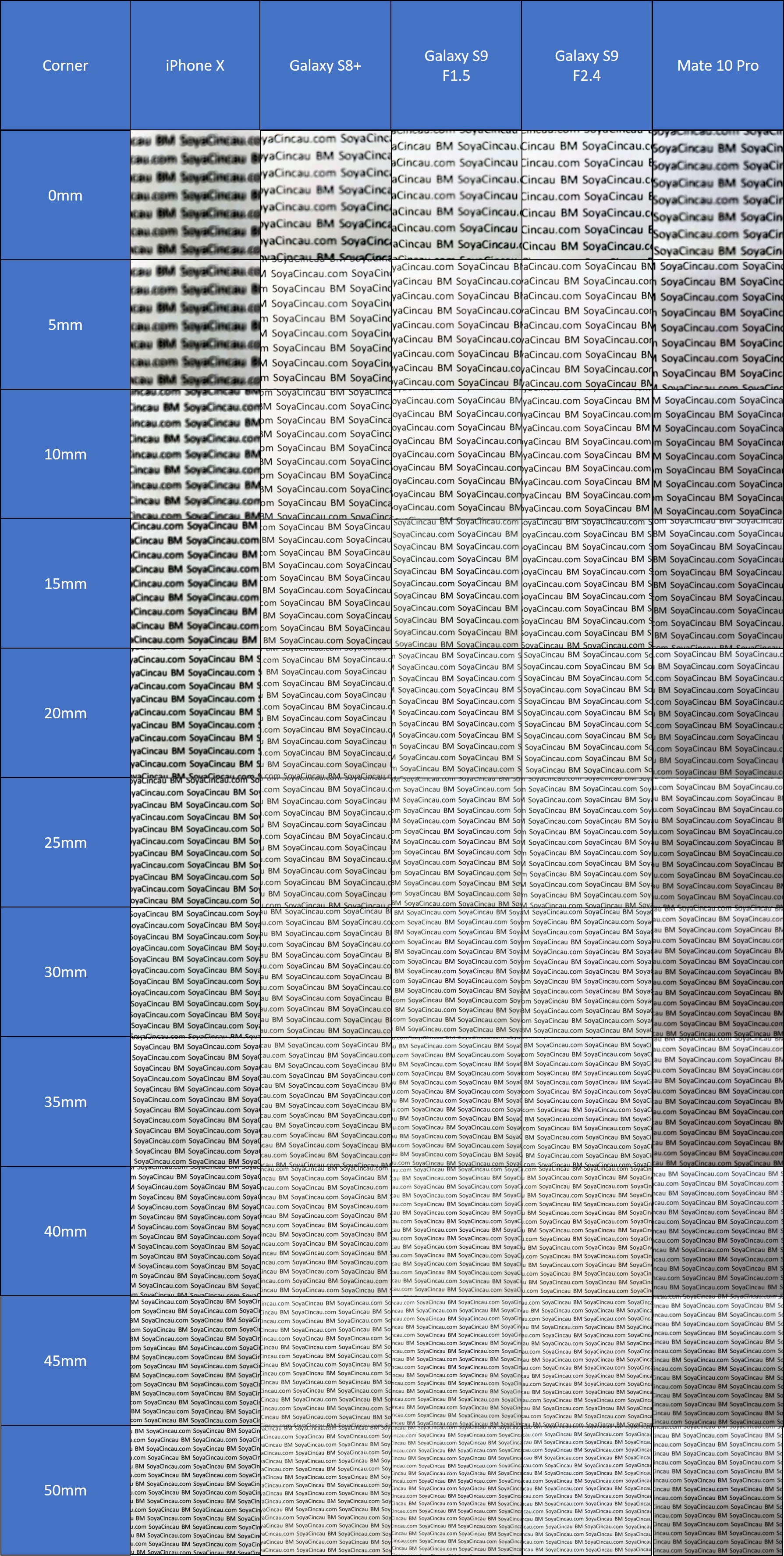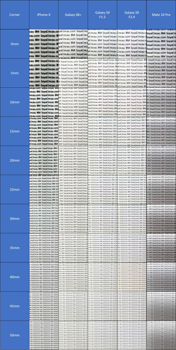 Although the Galaxy S9 looks fairly sharp right off the bat at 0mm, I wouldn’t consider that “in focus”. So, instead, it ties for first with the Galaxy S8+ though I will say that the S8+’s image does look a little softer than the S9’s at that distance.