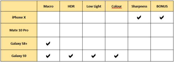 Athough it looked like the Galaxy S9 dominated with a score of 4, if you actually look at the images, you’ll know it’s not head and shoulders above the competition. Any one of these phones can take great pictures so just because the S9 launched, it doesn’t mean these other excellent smartphone cameras are rendered pointless.