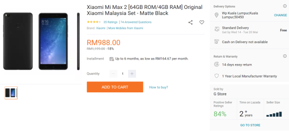 Retailer G Store is now offering the Mi Max 2 in Matte Black at only RM988. It is listed as a Xiaomi Malaysia unit which comes with 4GB of RAM and 64GB of storage.