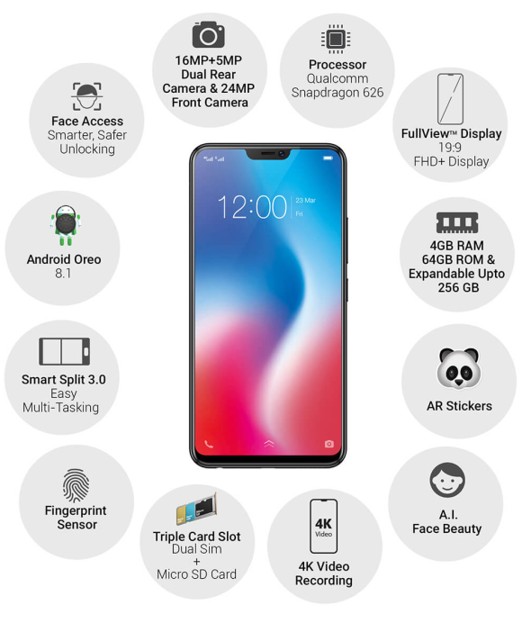 According to the spec sheet, the V9 will get a 6.3″ FullHD+ IPS display that pushes a taller 2280×1080 pixels resolution in a 19:9 display aspect ratio. This is similar to the OPPO R15 which will be announced very soon.