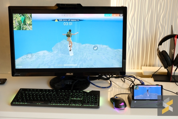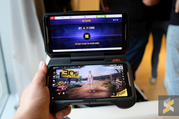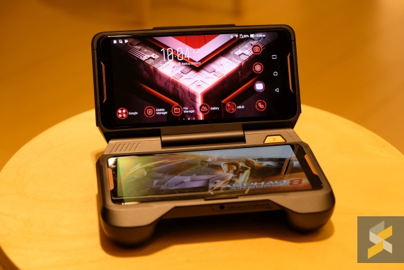But that’s not all. ASUS has also launched a bunch of accessories that you can use with the ROG Phone. One of it is a clamshell device called the TwinView Dock which basically turns your phone into a Nintendo DS. The idea is, you slot your phone into the top and play your games on both screens.
