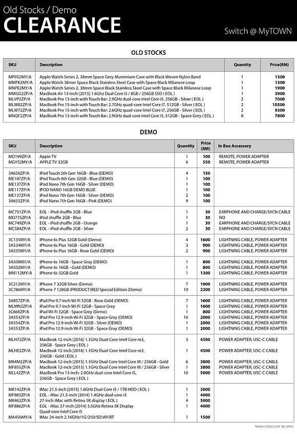 The clearance sale is happening at Switch’s outlet at MyTown Shopping Centre and they offer old stocks of Apple Watch, MacBook Air and MacBook Pro. If you’re looking for cheaper items, they have ex-demo units available ranging from RM30 iPod shuffle to RM100 iPod Touch and Apple TV. They are also offering a demo iMac 24″ from RM1,500 and a MacBook Pro 13″ (dual-core i5 with 256GB storage) at RM5,000.