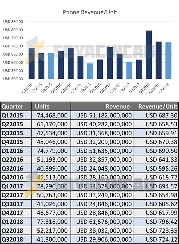 In terms of devices, Apple had sold 1% more iPhone units but revenue has increased by 20%. According to Tim Cook, the iPhone X continues to be the most popular iPhone model and you can tell from the average revenue per iPhone sold below: