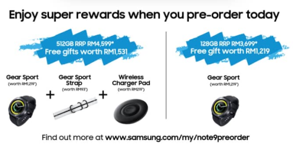The base Galaxy Note9 with 6GB RAM + 128GB storage model is priced at RM3,699 and Samsung is bundling a Gear Sport smartwatch worth RM1,219. Meanwhile, the higher spec 8GB RAM + 512GB storage option is priced at RM4,599. As a pre-order promo, Samsung is bundling a Gear Sport, Gear Sport Strap and a Wireless Charging Pad worth RM1,531 combined.