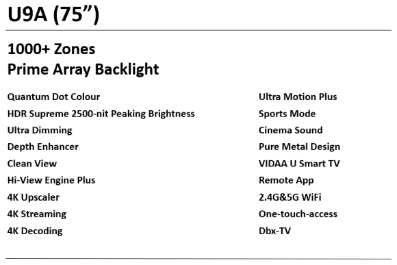 The Hisense U9A Premium ULED TV also has a picture quality index of 3,400 and has received the Annual Golden Award for Display technology. It won thanks to its major breakthroughs in display technologies like multi-area dynamic backlight control technology and high-definition processing engines.