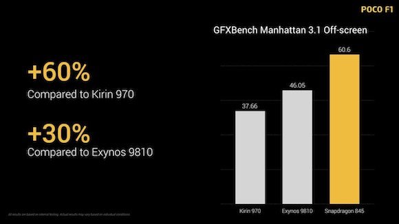 POCO also promises better performance for gaming using its Adreno 630 GPU that’s paired to the Snapdragon 845 processor. On GFXBench Manhattan tests, they claim to offer 60% better performance than Huawei’s Kiri 970 chipset and 30% better performance than Samsung’s Exynos 9810 processor.