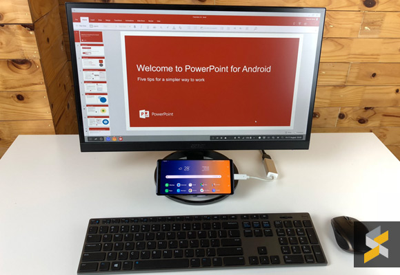 The Galaxy Note9 can be transformed into a PC-like experience with Samsung DeX. Using a compatible USB-C to HDMI, you can run Microsoft Powerpoint on your phone and project it onto a big screen or a projector.