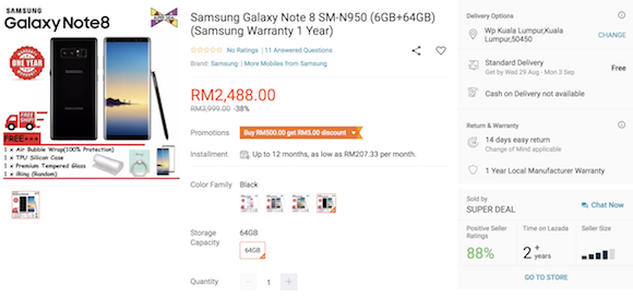 At Lazada, a retailer Super Deal, is also selling a Galaxy Note8 Malaysian set at a slightly lower price of RM2,488. According to the listing, this price is applicable to all colours.