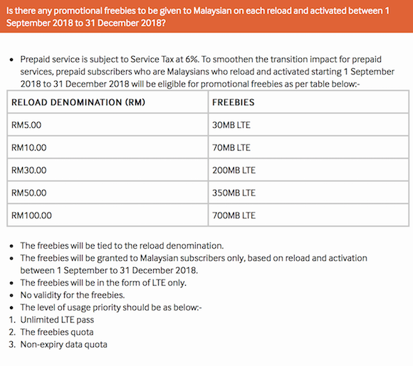 So what happens to mobile prepaid services in Malaysia? We’ve checked with the local telcos and basically, you’ll get slightly less credit for all reloads or top ups effective 1st September 2018. In short, a RM10 top up will only give you RM9.43 of credit. To cushion the blow, most telcos are throwing a little bit of extra freebies for every new top up.