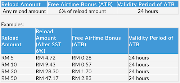 When GST was introduced on 1 April 2015, all prepaid top ups were charged 6% extra on top of their reload amount. So a RM10 top up costs RM10.60 at the cashier, but at least you’re assured that you’re getting RM10 of credit in your prepaid account.