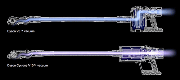 Another benefit to this redesign is a more linear airflow. This increases its Air Watts of suction making it more efficient than its previous V6, V7 and V8 vacuum cleaners.
