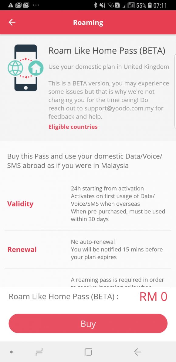Instead of a typical daily pass with fixed quota, Yoodo offers “Roam like Home” pass which allows you to utilise all of your current data for a flat rate. It usually costs RM10 for 24 hours and it’s only offered for selected Asian countries. Now they have added more countries including the US, Europe and Middle East, and you can activate this pass for free as part of their Beta phase for a limited time.
