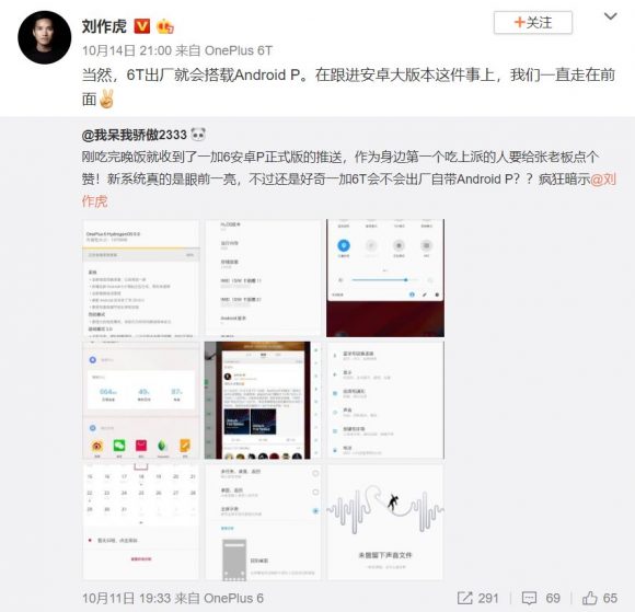 CEO Pete Lau made the confirmation that the OnePlus 6T will ship with Android 9 Pie on Weibo, one of the most popular social networks in China.