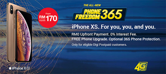 As written on Digi’s website, everyone (with an Asterisk highlighting it’s only for eligible Digi Postpaid customers) can own the iPhone XS with RM0 upfront payment, 0% interest fee, free phone upgrade and with 365 Phone protection. The phone protection was highlighted twice on the front page as well as on the iPhone XS promo page.