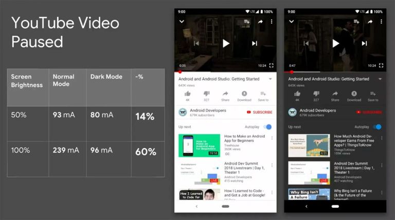 While many Google apps are predominantly white, some apps like YouTube do feature dark mode. As demonstrated, it consumes less energy compared to the normal mode. At full brightness, YouTube in dark mode uses 43% less power than the normal mode.