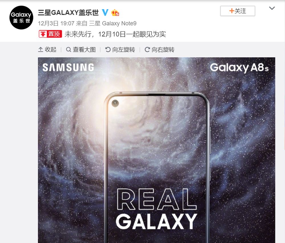 Samsung will be the first manufacturer in the world to launch a phone that features a punch-hole display. The phone, called the Galaxy A8s will be making its debut on December 10 in China. Samsung posted the information on Weibo yesterday.